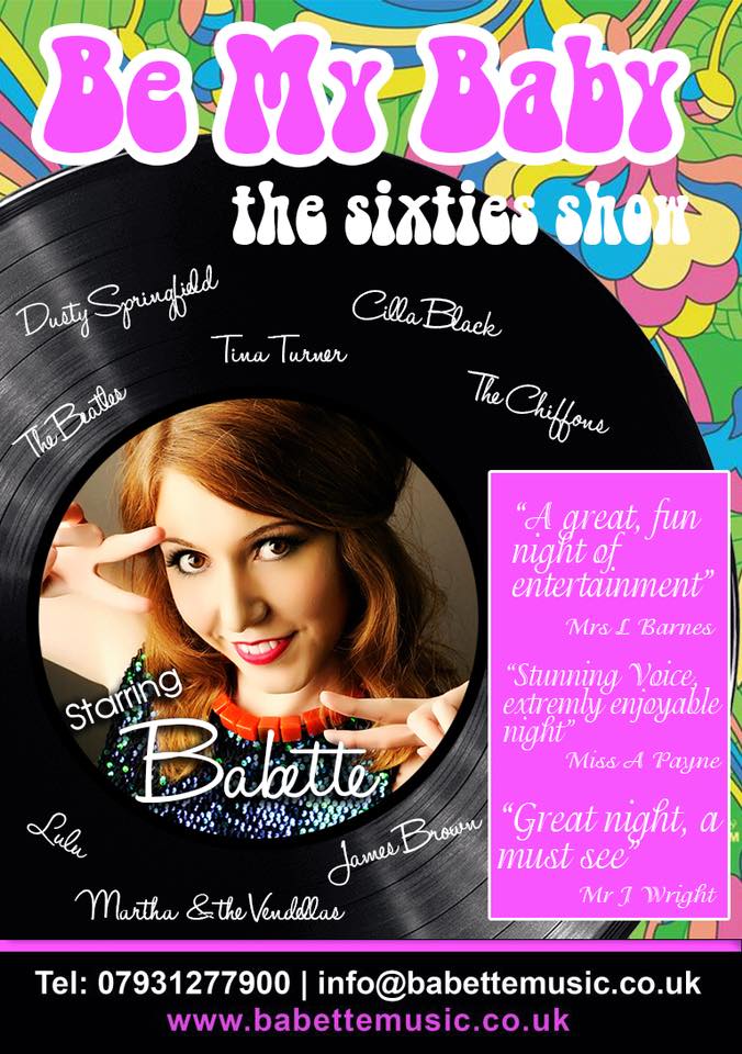 All your 60’s favourites jam packed in to one outstanding performance by professional cabaret singer and entertainer Babette. With a stunning vocal talent and large repertoire of 60’s classics this show includes hits from Lulu, Martha & The Vandellas, Dusty Springfield, Stevie Wonder, Cilla Black, The Beatles, The Ronettes, Dirty Dancing and many more….